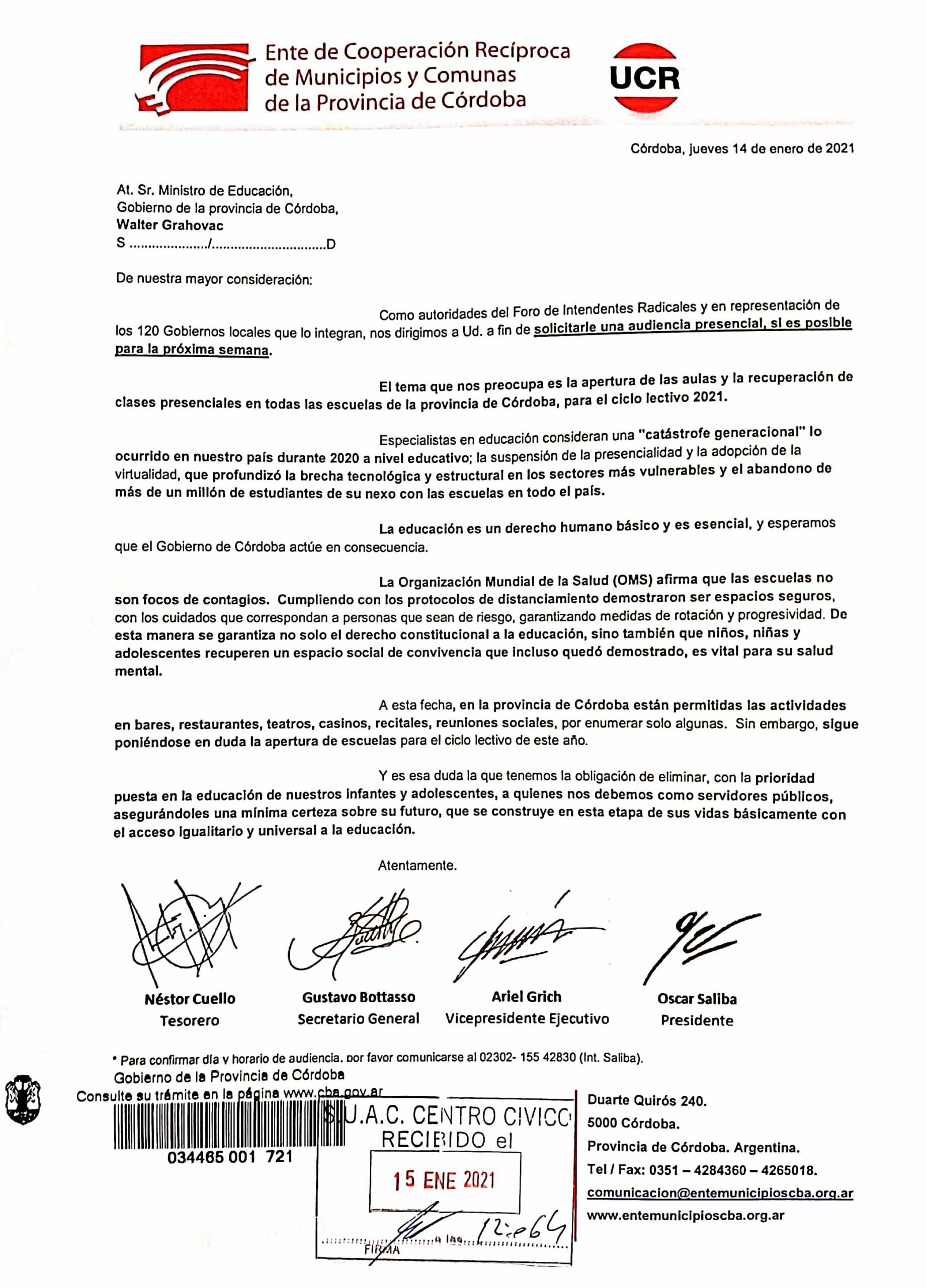 Ese es el pedido de nuestras autoridades elevado por nota al ministro de Educación del Gobierno de Córdoba, Walter Grahovac, para el ciclo lectivo 2021.
